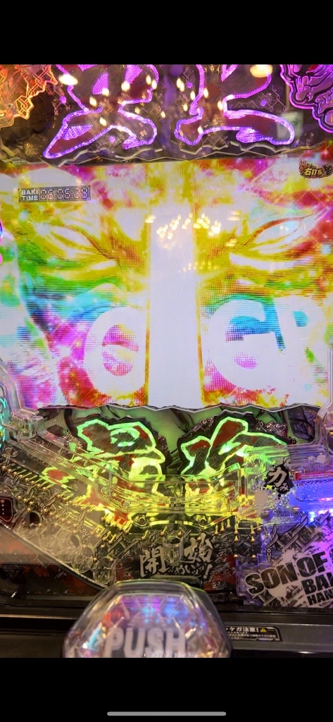 6月2日午後7時5分、69回大当り6万9千発出てる台で、新しい台枠の範馬刃牙のカスタマイズをやろうと新しい十字キーをいじっている間に画面が金色に変わって、左側に花山薫のカスタマイズが“祝”の文字で大当りを告げています。
