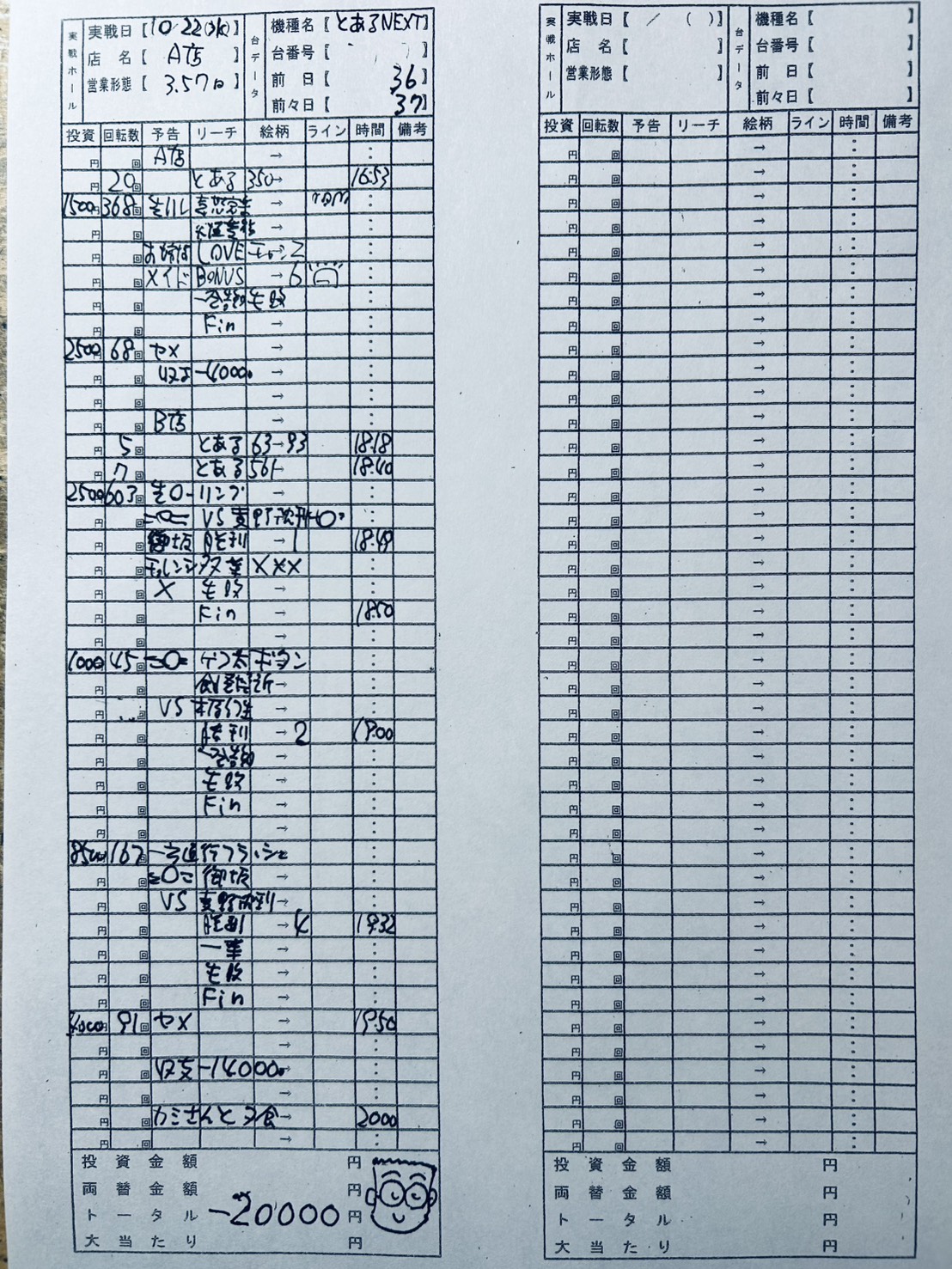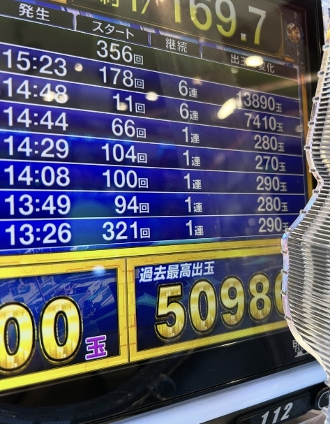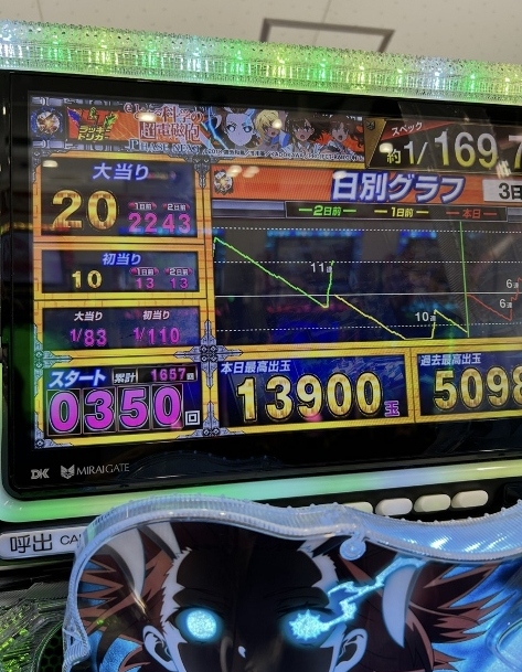 やっと空いたのは午後4時53分、20回大当りして1万3900発出て350回転の台です。