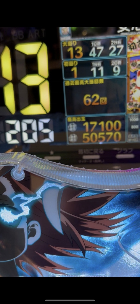 1店目、5台のうち1台、13回大当りで205回転、1万7千発すでに出ちゃってる台です。