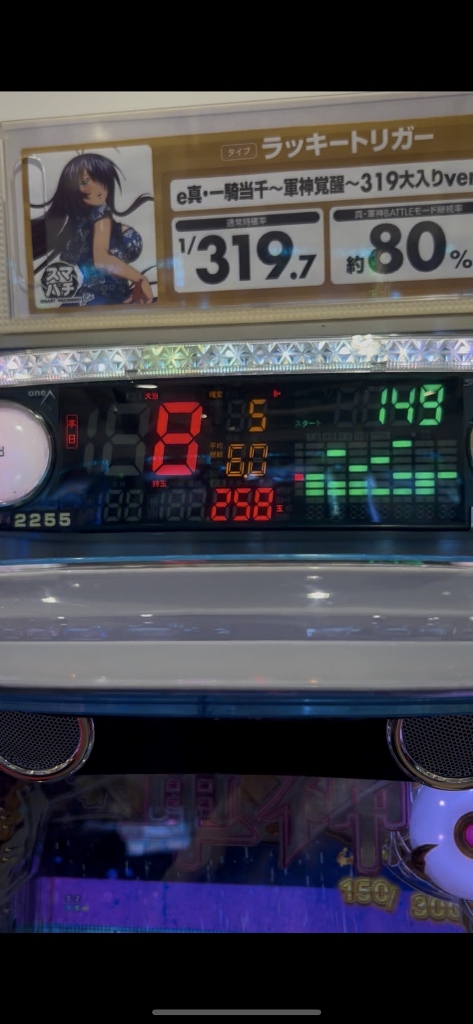 真・一騎当千のヘソが広がって319分の1で出てますが、一騎当千はとにかくよく当るパターンと簡単に千回ハマるパターンの台にハッキリ分かれていて、ダメな日は誰も座らなくなってしまいました。