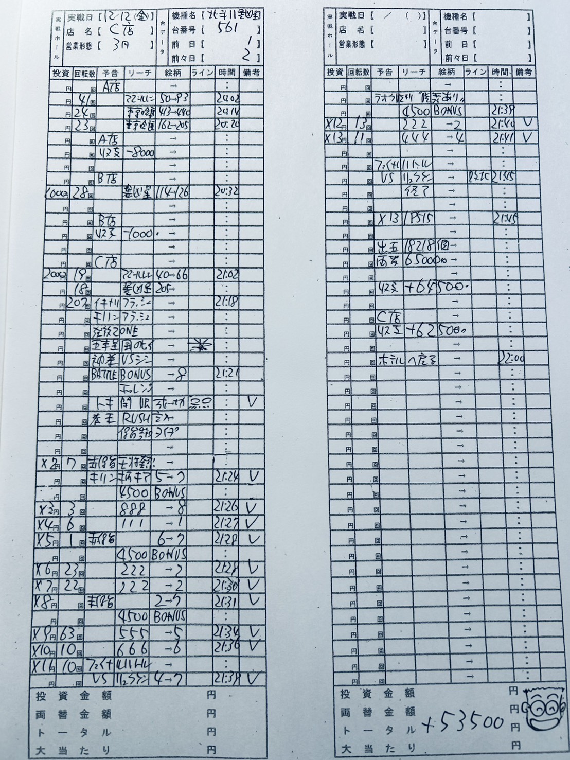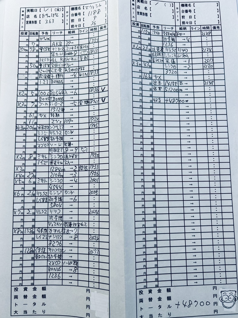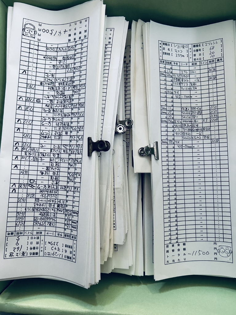 パチンコホールの常連さんのマコトくんのお姉さんが当時はまだ珍しいコンピュータープログラマーの仕事をしていて、ドンキホーテのイラスト入りの収支表を作ってくれて、その用紙をつい最近まで30年近く使用して、収支を記録してゴッソリ溜まっています。