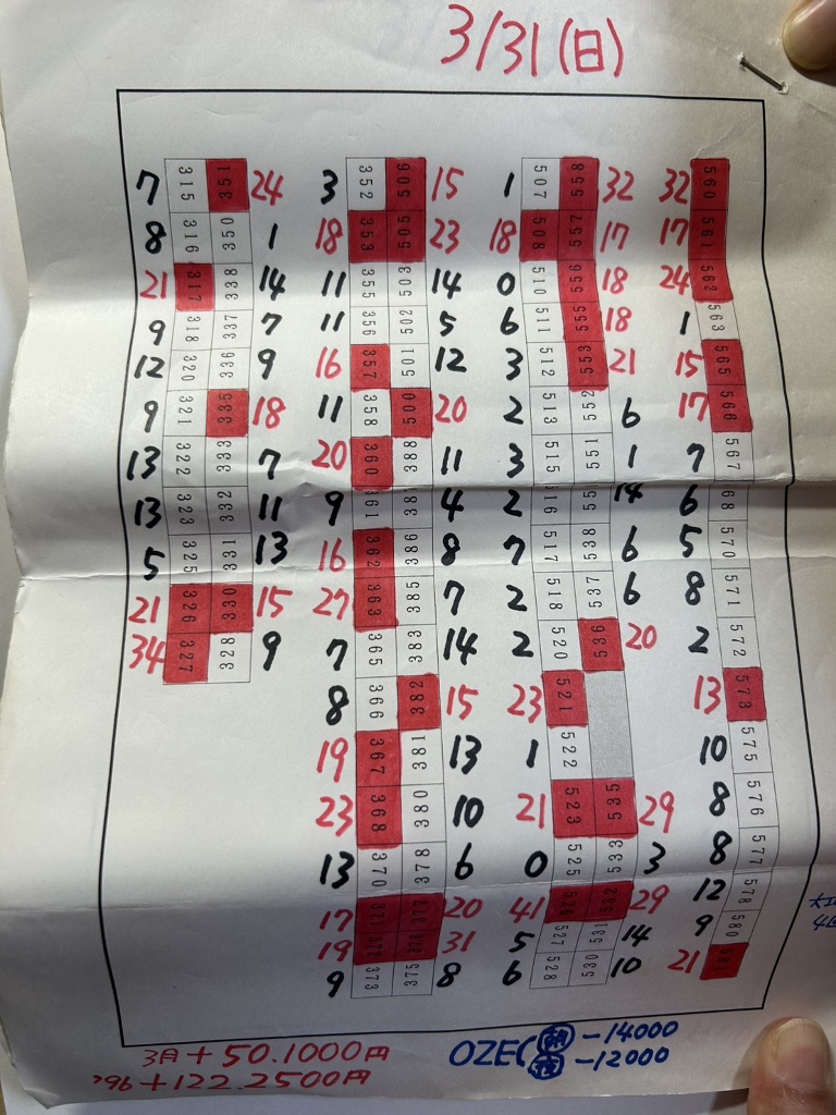 32年前は初代CR花満開の全台の大当り回数を書き込んだデータ用紙に、その日の実戦データをメモして保管して、週刊モーニングのネタに合わせた収支をピックアップしていました。