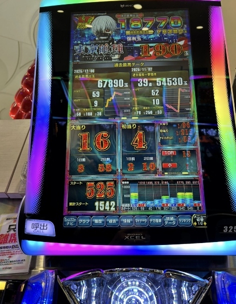 そんな中、またしても東京喰種がメインコーナーのホールで、“DAIKOKU”ダイコク電機のパチンコ台よりデカいデータランプの東京喰種でSANKYO&Bisty40の倍数の中ハマリ560回転狙いで、またまた1万9千発です。
