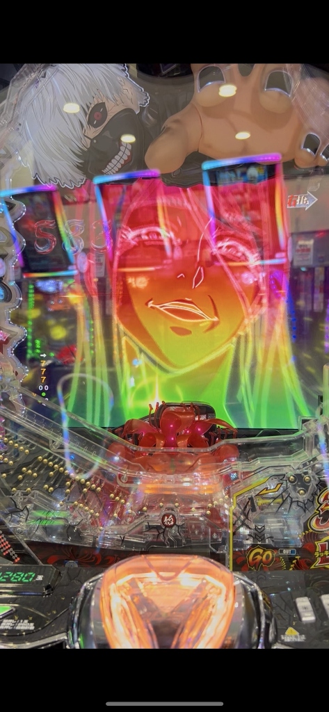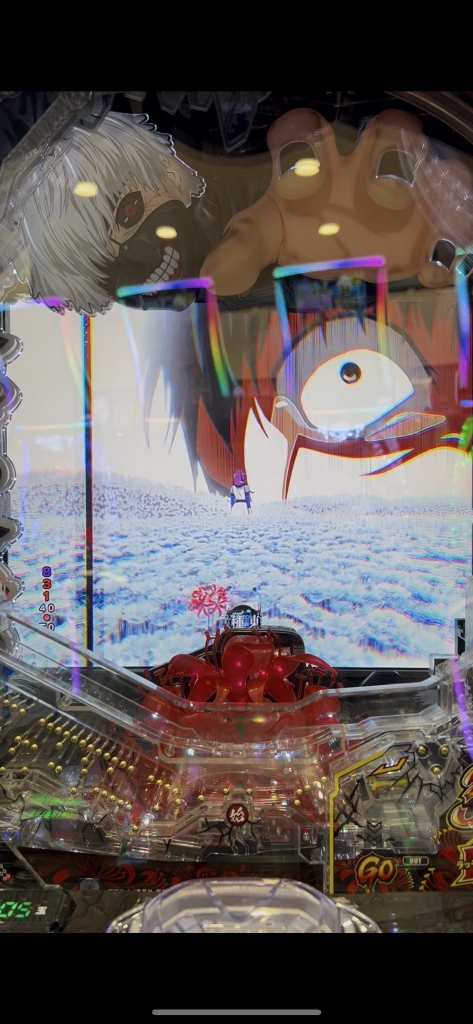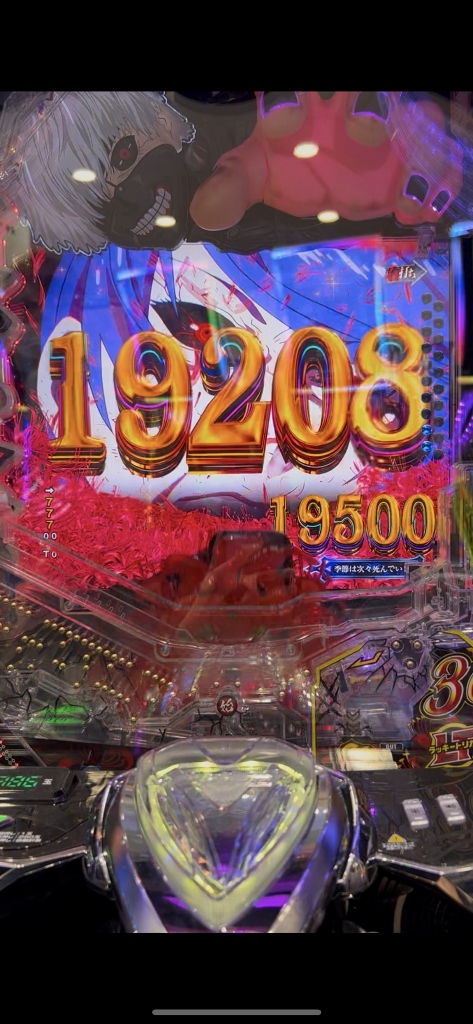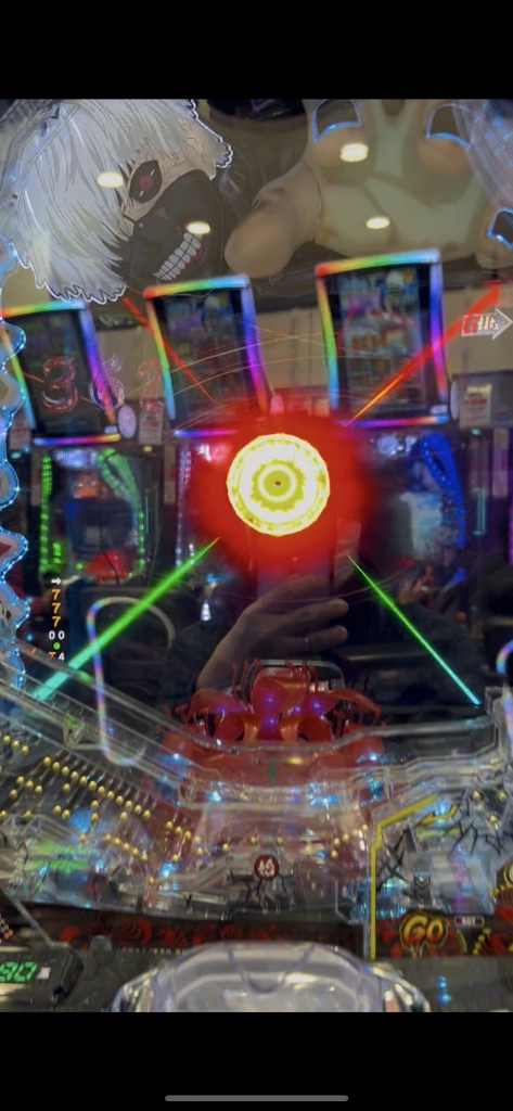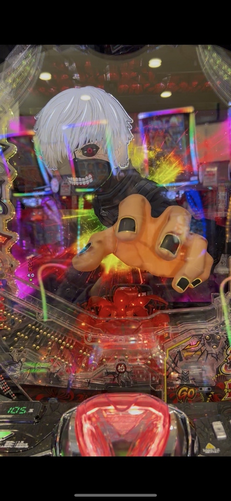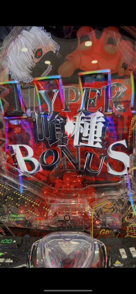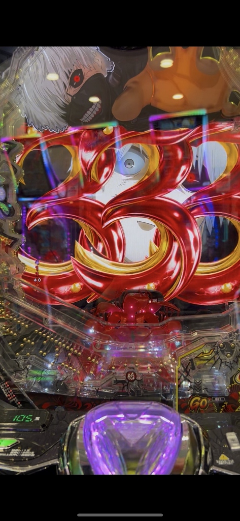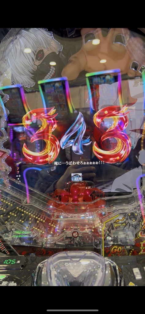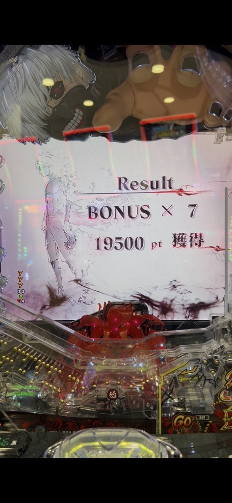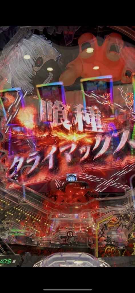 500円を打ち切らずに台移動するボクを不思議そうに喰種の常連さんたちが見てる中、喰種クライマックスリーチでオスイチハズれたかと思ったら、ドゥゥゥと喰MAXハンドが落ちて赤い3図柄大当りです。
