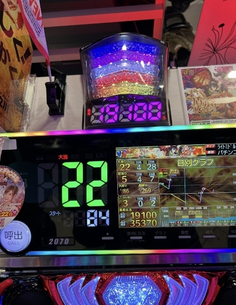 今日は4台中2台が2万発出ているうち、1台が22回大当りして1万9千発出て、ST80回を終了して84回転即ヤメです。