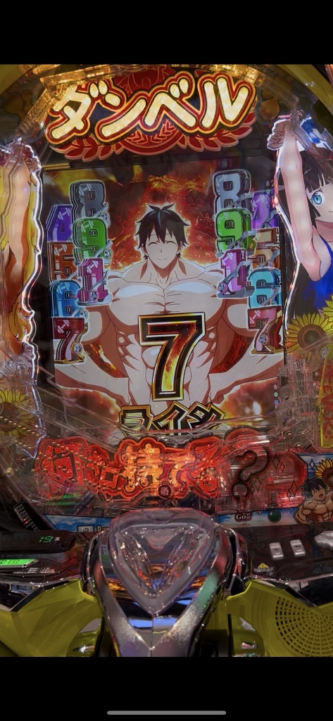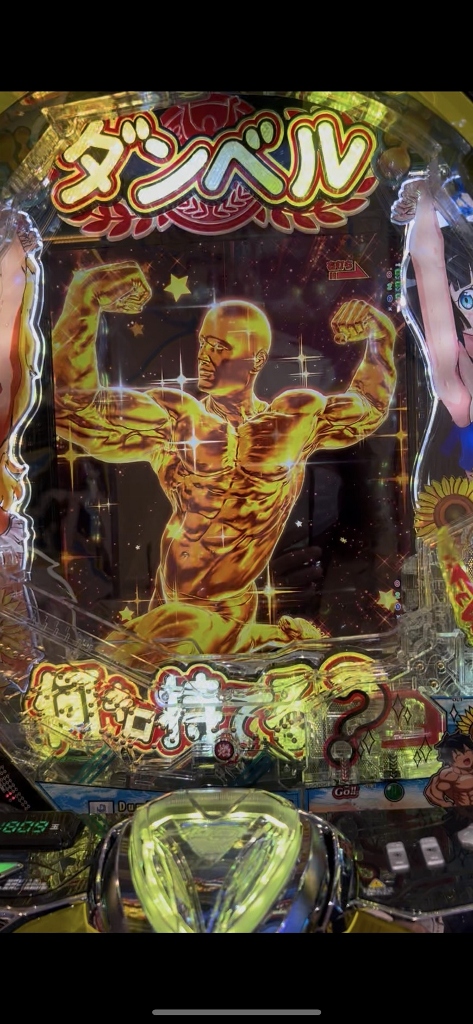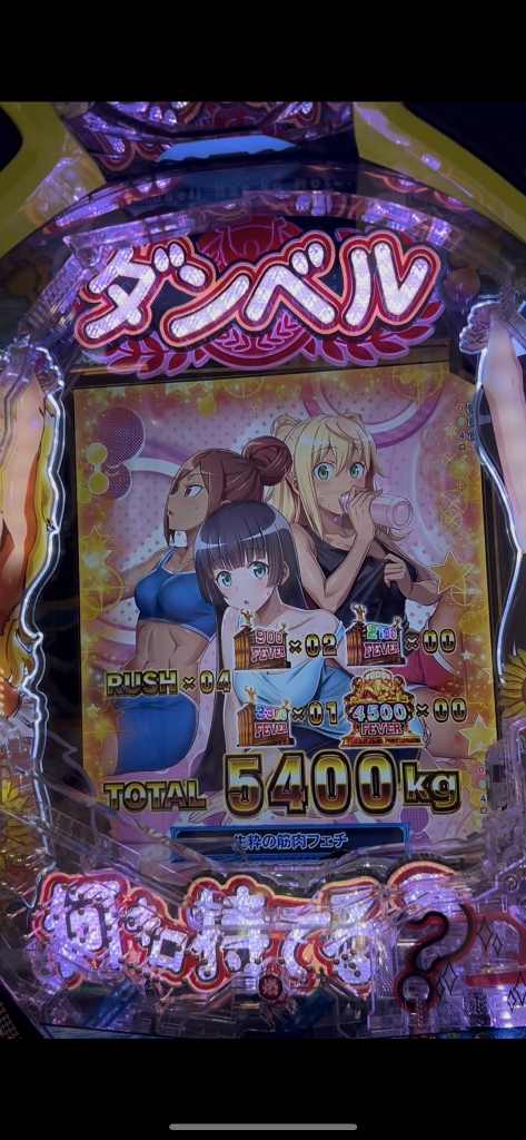 例えば今日18日水曜日、3台しか入っていないeフィーバーダンベル何キロ持てる?2で、1台0回35回転の台が空いています。2台は若者が2人粘っています。