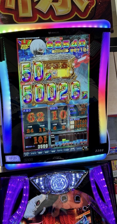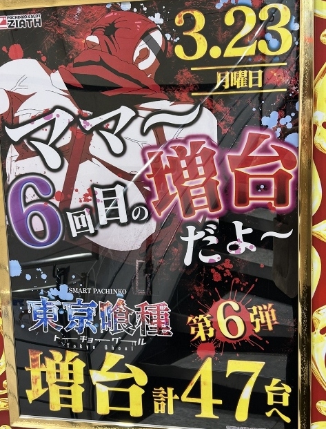 月に1回か2回、東京喰種に座れたらラッキーと言えるくらい47台満席のホールです。座れれば勝てるホールなのです。