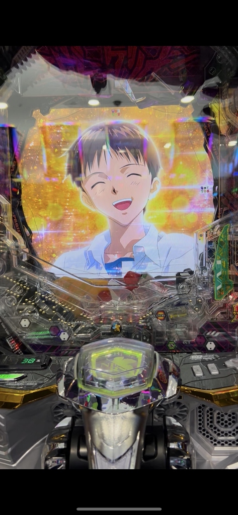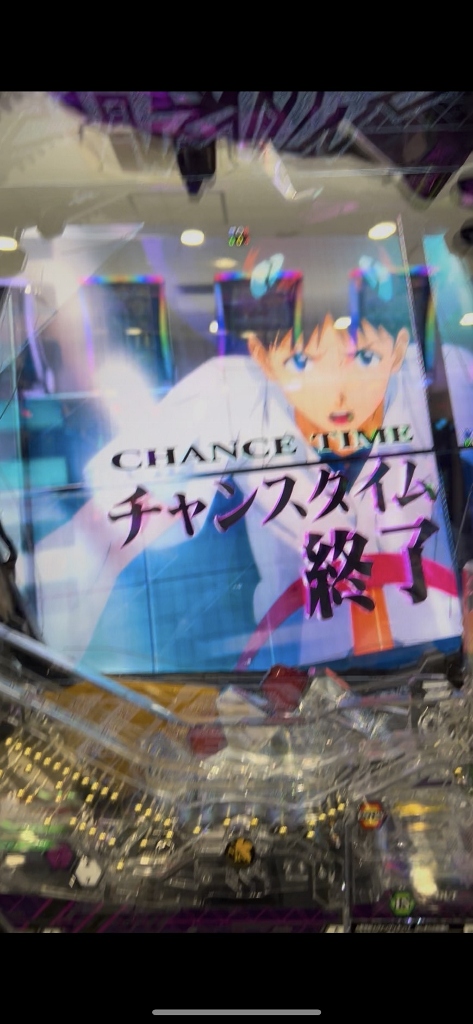 チャンスタイム100回が終わって出玉をツっ込んでたら127回転、レバブルからレイ拝啓で単発の2図柄がシンジの黄金の微笑で3図柄昇格、9900発です。
