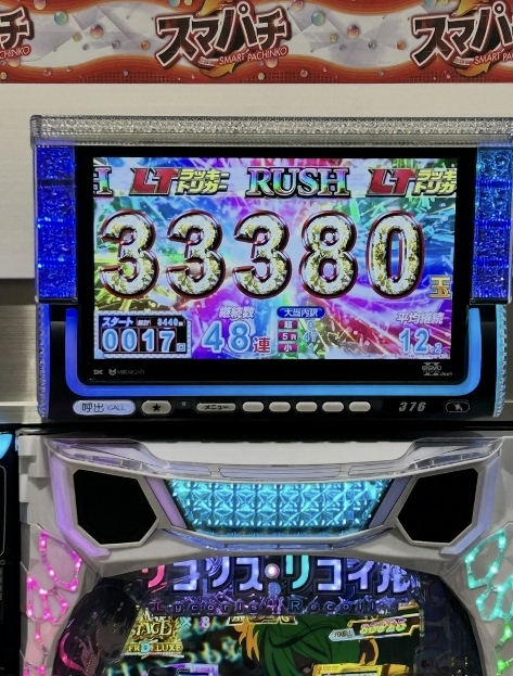 いまのパチンコで一撃3万発48連チャンなんて“おちゃのこさいさい”、20~30連は当たり前で40~50連!中には60~80連くらい平気でしちゃうのがリコリス・リコイルの人気の秘密です。