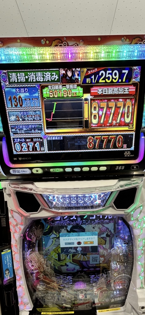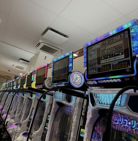 RUSHに入らず400~500ハマリをくり返す、お金を吸う裏リコリコにハマってるお客さんが、カラフルなネオンのシマでポツンと静まり返っていて、それでも一撃万発どころか3~4万発のRUSHがいつか来ると信じて打ち続けるお客さんで空くことはありません。
