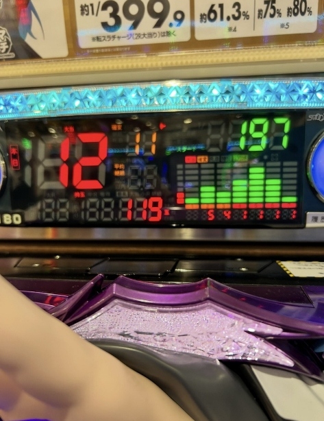 12回出て197回転の台で200回転ジャスト、右下のスライムの丸い電球がレインボーに光ります。